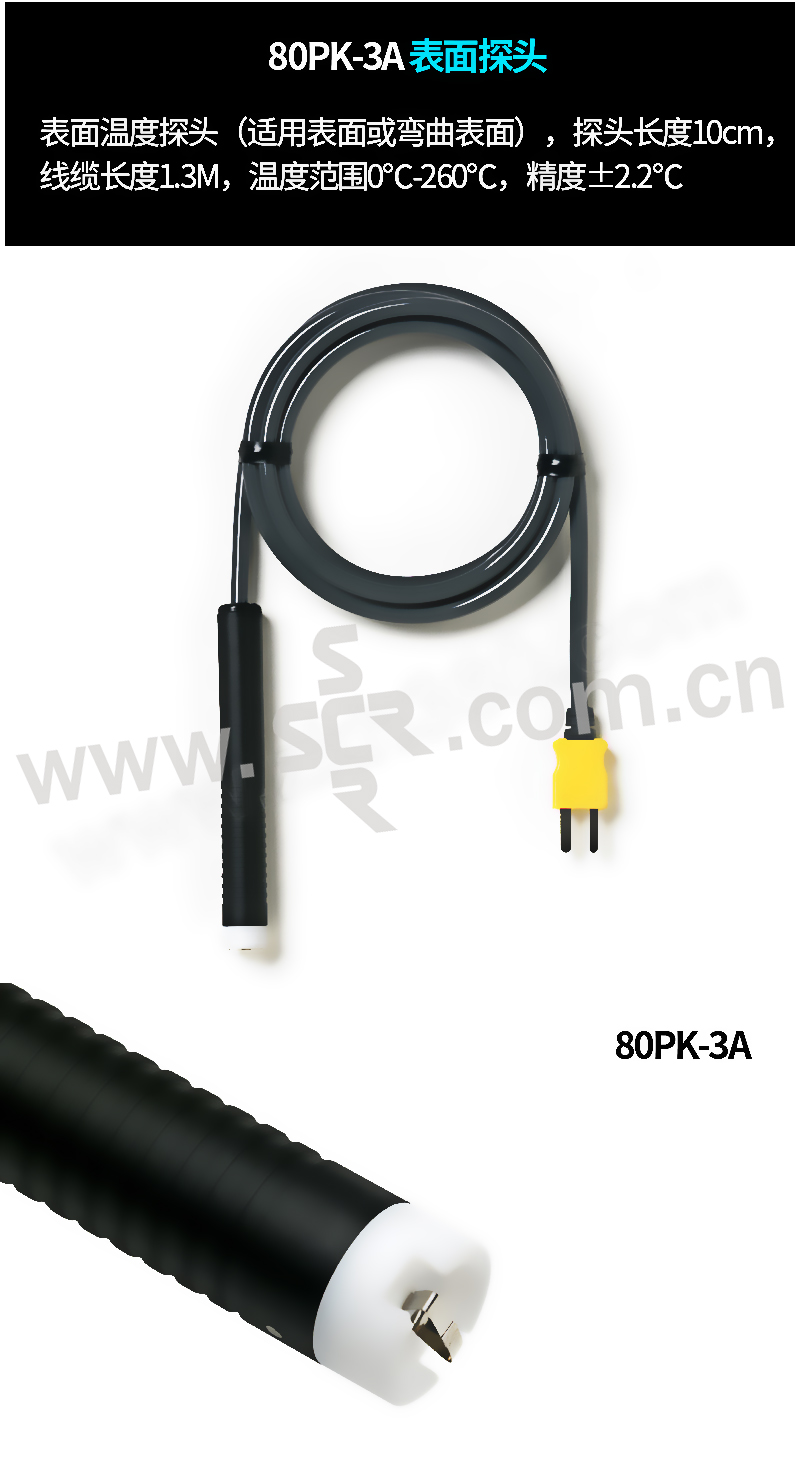 ·80PK-3A表面探头·福禄克温度探头,扩展福禄克测温仪功能。80PK-3AK型热电偶表面探头设计用于测量平坦或微凸表面的温度,外露式结点可直接接触被测表面。该探头可与任何支持K型热电偶并具有微型连接器输入的测温仪配合使用。