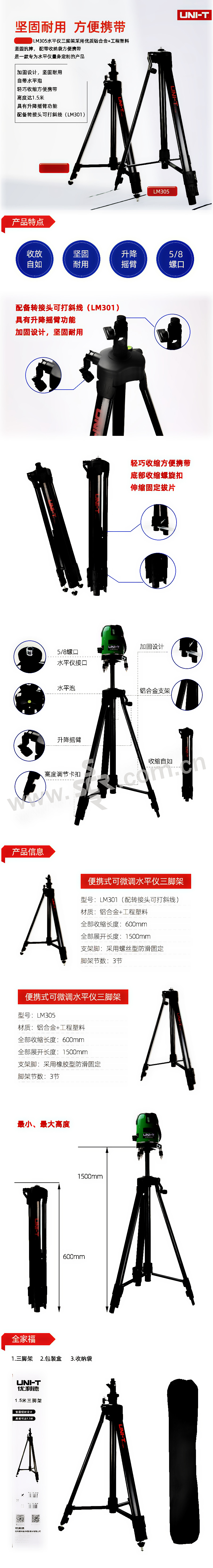 ·LM301、LM305水平仪三脚架采用优质铝合金、工程塑料、坚固抗摔,配带收纳袋方便携带,是一款专为水平仪量身定制的产品