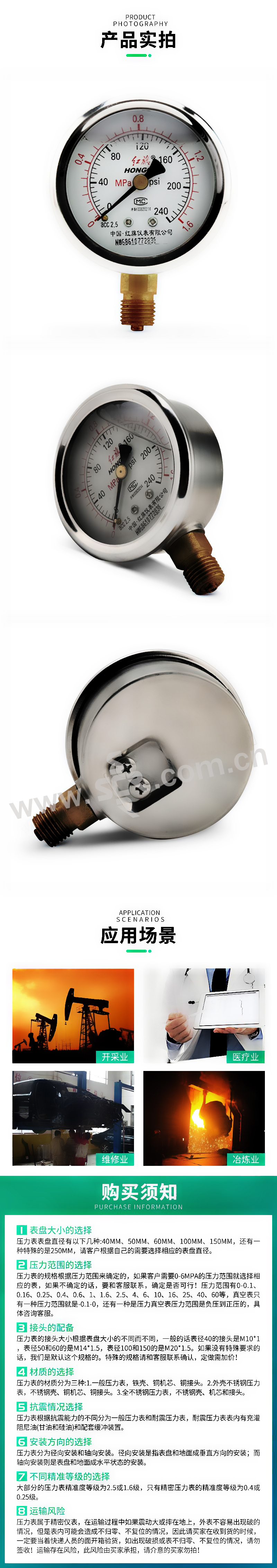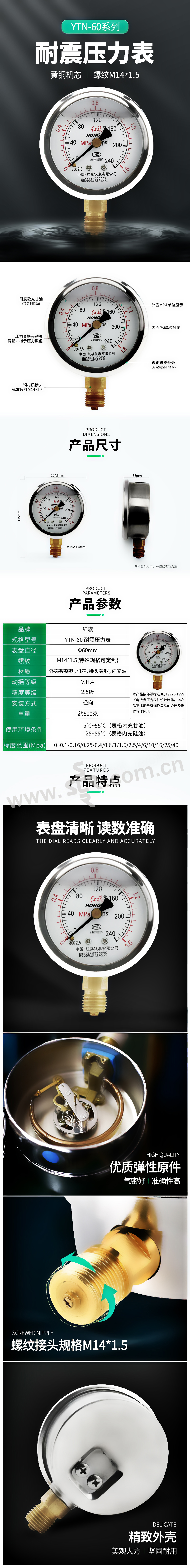 HONGQI/红旗 耐震压力表 YTN-60 0~0.1MPa 1只