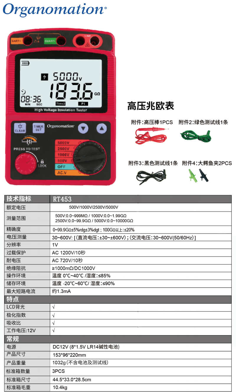 规格:  额定电压:500V/1000V/2500V/5000V 制造商型号:  RT453