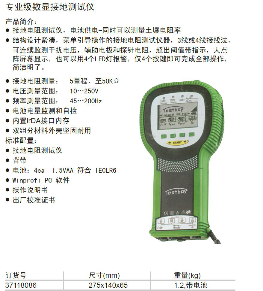 · 接地电阻测试仪,电池供电-同时可以测量土壤电阻率 · 结构设计紧凑,菜单引导操作的接地电阻测试仪器,3线或4线接线法、 可连续监测干扰电压,辅助电极和探针电阻,超出阈值带指示,大点 阵屏幕显示,也可以用4个LED灯报警,仅4个按键即可完成全部操作, 简洁明了。 · 接地电阻测量: 5量程,至50KΩ · 电压测量范围: 10…250V · 频率测量范围: 45…200Hz · 电池电量监测和自检 · 内置lrDA接口内存 · 双组分材料外壳坚固耐用 标准配置: · 接地电阻测试仪 · 背带 · 电池:4ea 1.5VAA 符合 IECLR6 · Winprofi PC 软件 · 操作说明书 · 出厂校准证书