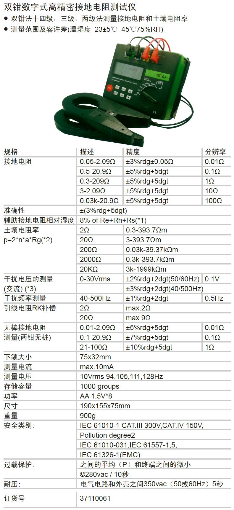 ·双钳法十四级,三级,两级法测量接地电阻和土壤电阻率 · 测量范围及容许差(温湿度 23±5℃ 45℃75%RH) ·安全类别: IEC 61010-1 CAT.III 300V,CAT.IV 150V, Pollution degree2 IEC 61010-031,IEC 61557-1,5, IEC 61326-1(EMC)
