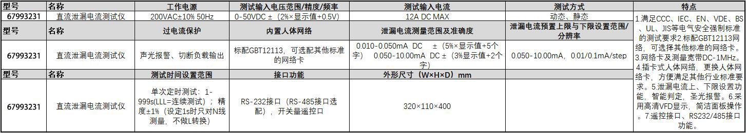 ·满足CCC、IEC、EN、VDE、BS、UL、JIS等电气安全强制标准的测试要求 ·标配GBT12113网络,可选择其他标准的网络卡。 ·网络卡及测量宽带DC-1MHz。 ·插卡式人体网络,更换人体网络卡,方便满足其他行业标准要求。 ·泄漏电流上、下限设置功能,智能判定,圣光报警。 ·采用高清VFD显示,简洁面板操作。 ·遥控接口、RS232/485接口功能。 ·单次定时测试:1-999s(LLL=连续测试); ·精度±1%(设定1s时只对N线测量,不做L转换)