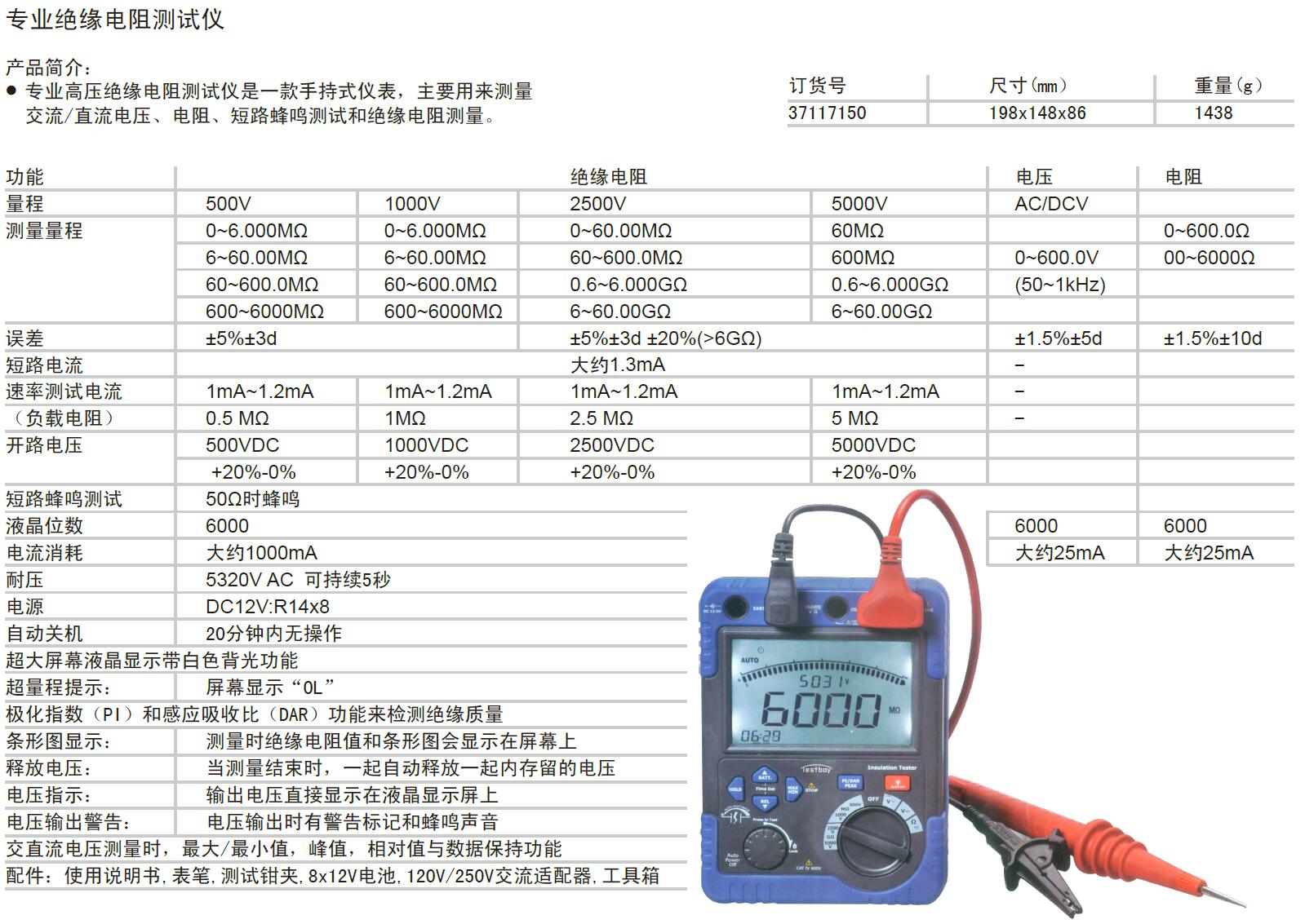 ·专业高压绝缘电阻测试仪是一款手持式仪表,主要用来测量交流/直流电压、电阻、短路蜂鸣测试和绝缘电阻测量。