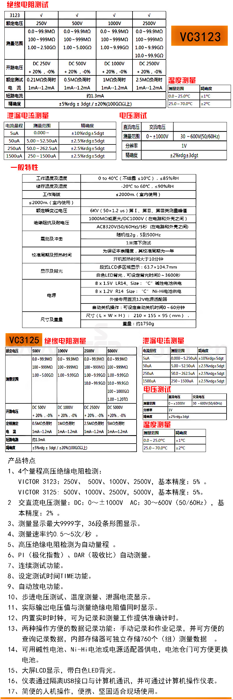 ·测试电压:2500V·绝缘电阻:100GΩ·短路电流:约1.3mA·多种测量模式:单点快速测量、定时测量、吸收比测量、极化指数测量、步进电压测量。·自动放电及显示放电电压。·开放式原始通讯协议,便于用户二次开发使用。