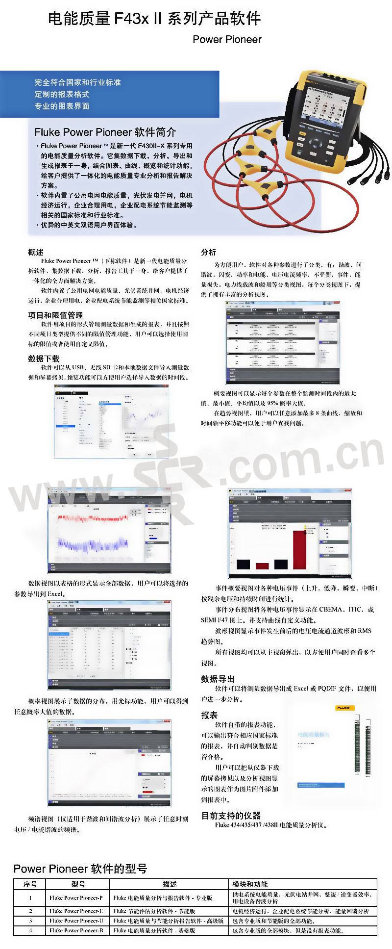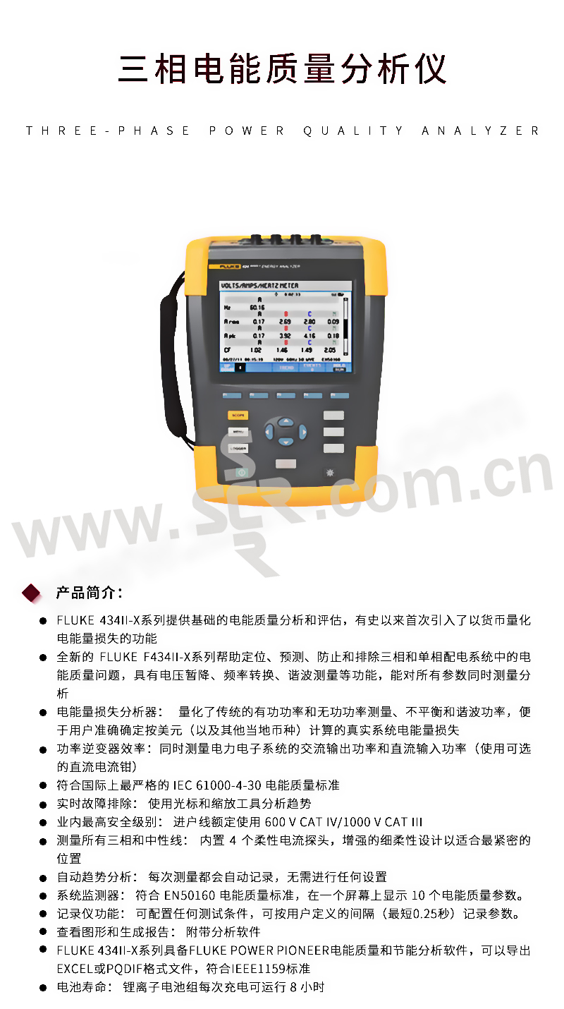 ·电能量损失分析器: 通过对标准的有功和无功功率测量、不平衡和谐波功率进行量化,以确定电能损失造成的财务成本。 ·实时故障排除: 使用光标和缩放工具分析趋势。 ·业内高安全级别: 进户线额定使用 600 V CAT IV/1000 V CAT III。 ·测量所有三相和中性线: 内置 4 个柔性电流探头,增强的细柔性设计以适合最紧密的位置。 ·自动趋势分析: 每次测量都会自动记录,无需进行任何设置。 ·系统监测器: 根据 EN50160 电能质量标准,在一