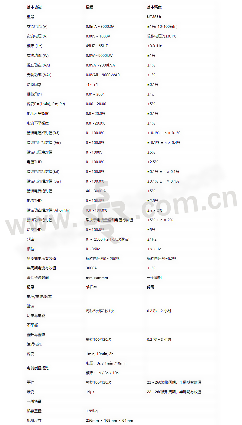 ·满足IEC标准和GB系列国家电能质量标准的全面电能质量监测; ·电能质量精度符合DL/T1028-2006《电能质量测试分析仪检定规程》; ·85~400V交流电源供电或内置锂电池供电; ·多种事件自动捕捉,阈值可设,记录详细的触发波形和事件特征值; ·具有稳态数据记录功能,记录间隔可设,保存间隔内的最大值、最小值和平均值; ·具有离线任务设置功能,可提前设定多个不同测量点的任务信息和内容; ·中英文键盘可方便输入监测点信息,拨轮操作简捷方便;