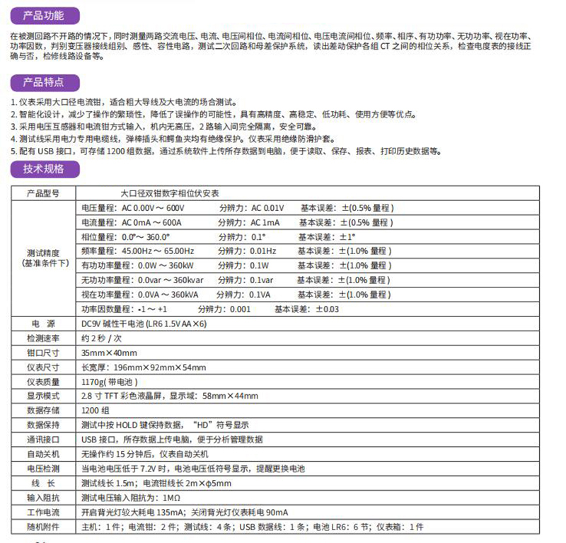 ·仪表采用大口径电流钳,适合粗大导线及大电流的场合测试。 ·智能化设计,减少了操作的繁琐性,降低了误操作的可能性,具有高精度、高稳定、低功耗、使用方便等优点。 ·测试线采用电力专用电缆线,弹棒插头和鳄鱼夹均有绝缘保护。仪表采用绝缘防滑护套。 ·配有USB接口,可存储1200组数据,通过系统软件上传所存数据到电脑,便于读取、保存、报表、打印历史数据等。