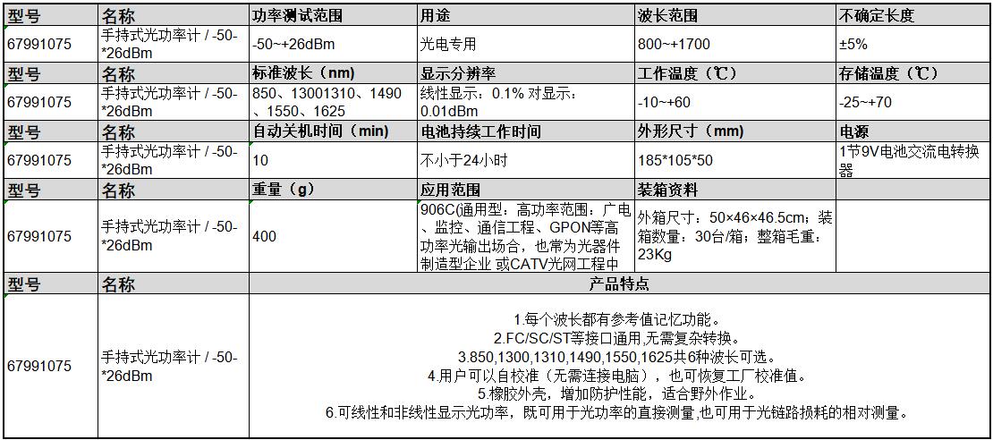·每个波长都有参考值记忆功能。 ·FC/SC/ST等接口通用,无需复杂转换。 ·850,1300,1310,1490,1550,1625共6种波长可选。 ·用户可以自校准(无需连接电脑),也可恢复工厂校准值。 ·橡胶外壳,增加防护性能,适合野外作业。 ·可线性和非线性显示光功率,既可用于光功率的直接测量,也可用于光链路损耗的相对测量。 ·906C(通用型:高功率范围:广电、监控、通信工程、GPON等高功率光输出场合,也常为光器件制造型企业 或CATV光网工程中使用)。