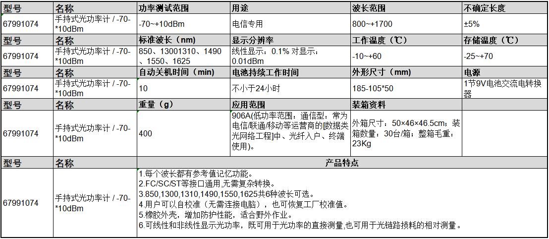 ·每个波长都有参考值记忆功能。 ·FC/SC/ST等接口通用,无需复杂转换。 ·850,1300,1310,1490,1550,1625共6种波长可选。 ·用户可以自校准(无需连接电脑),也可恢复工厂校准值。 ·橡胶外壳,增加防护性能,适合野外作业。 ·可线性和非线性显示光功率,既可用于光功率的直接测量,也可用于光链路损耗的相对测量。 ·906A(低功率范围:通信型:常为电信/联通/移动等运营商的[数据类光网络工程]中、光纤入户、终端使用)。