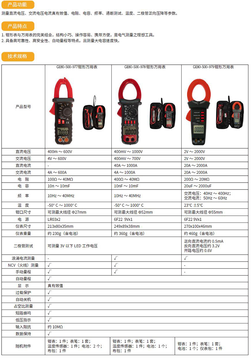 ·钳形表与万用表的完美组合,结构小巧、操作容易、携带方便,是电气测量之理想工具。