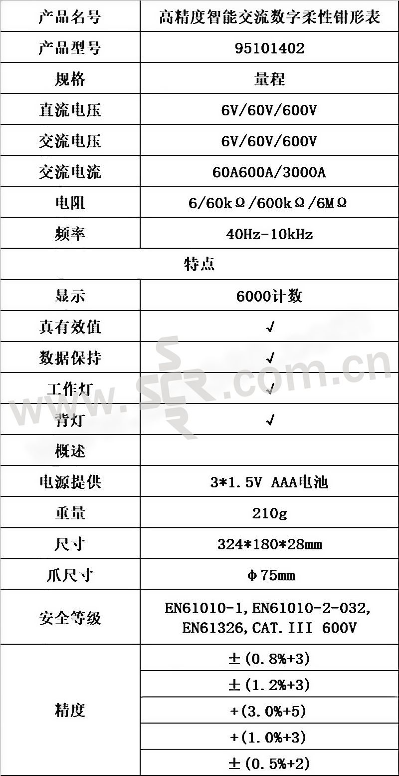 高精度智能交流数字柔性钳形表 95101402 直流电压量程6V/60V/600V 交流电压量程6V/60V/600V 1个
