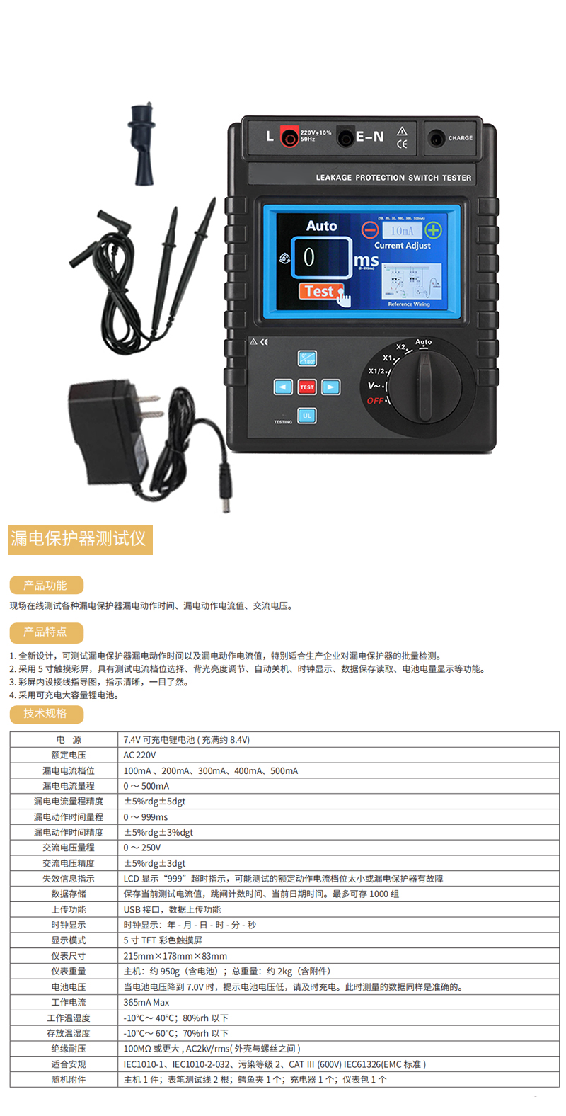 ·该测试仪为手持式,体积小,重量轻,便于携带,是各种漏电保护器现场或室内检测的测试仪表。