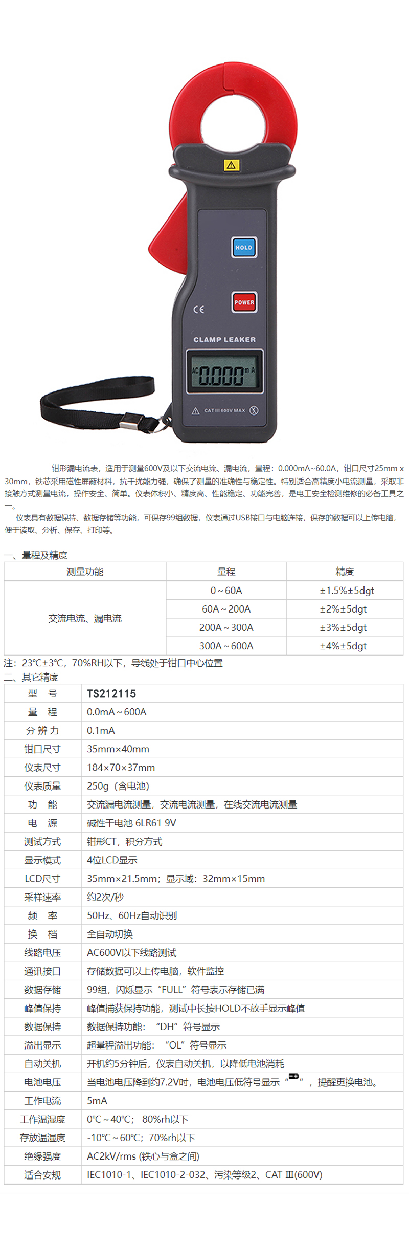 ·高精度钳形漏电流表是专为测量交流漏电流而精心设计制造的,采用最新CT技术及数字集成技术,具有体积小,精度高,功能完善的特点。 .广泛适用于电力、通信、气象、铁路、油田、建筑、计量、科研教学单位、工矿企业等领域。其传感铁芯选用特殊合金,采用磁性屏蔽技术,几乎不受外界磁场的影响,确保了常年无间断测量的高精度、高稳定性、高可靠性。