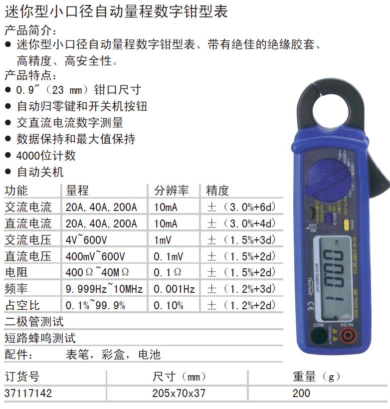 ·迷你型小口径自动量程数字钳型表、带有绝佳的绝缘胶套、