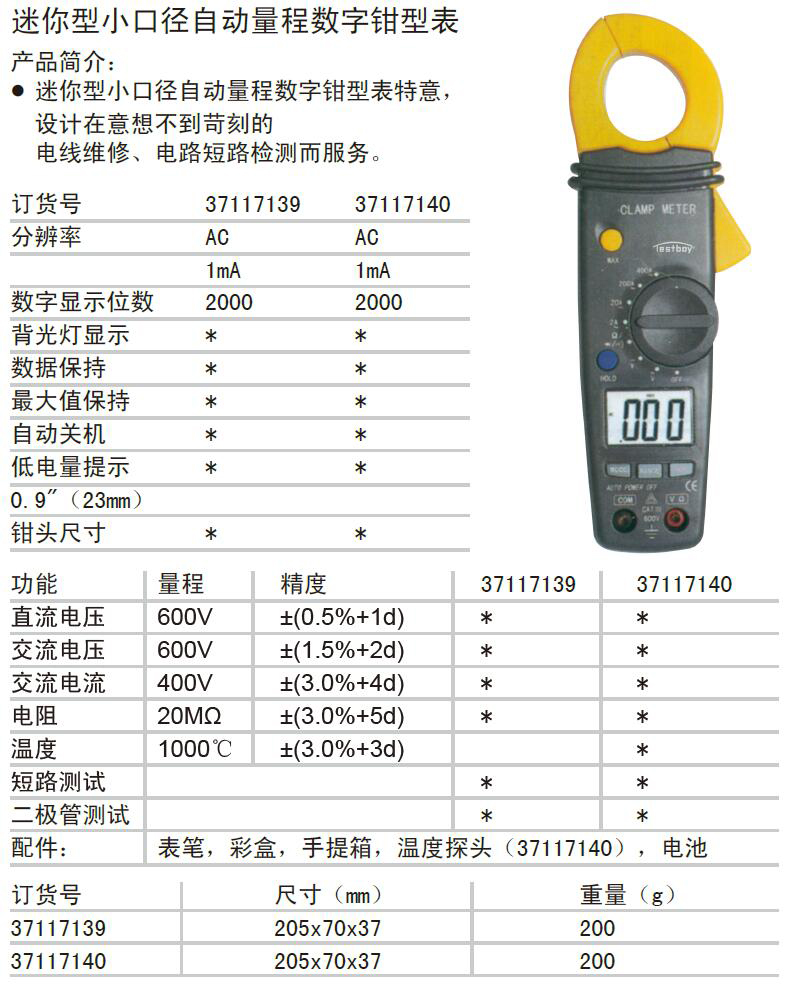 说明 ·产品简介: · 迷你型小口径自动量程数字钳型表特意, 设计在意想不到苛刻的 电线维修、电路短路检测而服务。