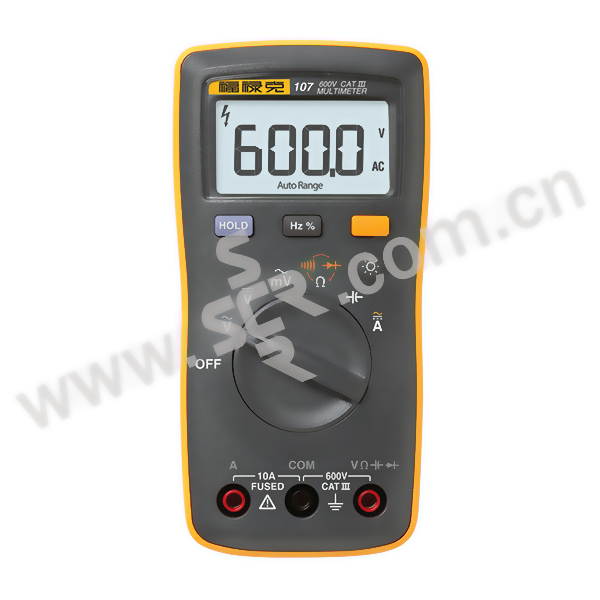 ·设计精巧,外观时尚,掌上尺寸设计,握感舒适,仅重200g,携带方便 ·完备的测试功能,包括交直流电压测量,交直流电流测量,电阻测量,通断测量,电容测量,电阻测量,通断测量,二极管测量(F-107),频率以及占空比测试(F-107)等功能,满足基础电气维修,电工测量,以及电子测量等应用领域 ·全参数自动量程测试,测试方便迅速;同时减少了波盘旋转次数,延长仪表寿命 ·符合IEC61010-1 CATIII 600V 过电压保护安全标准,扩展了测试应用范围,而且测试更加安全,即保
