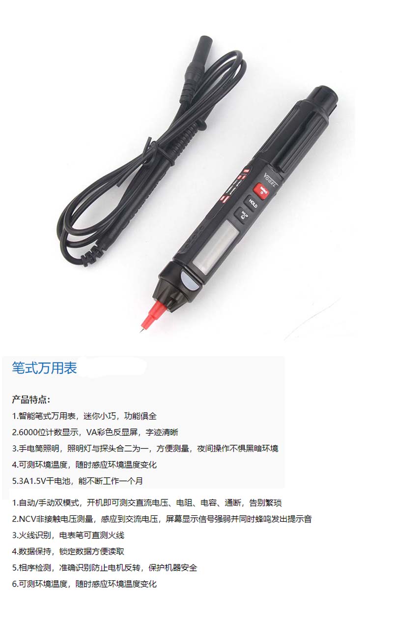·智能笔式万用表,迷你小巧,功能俱全 ·6000位计数显示,VA彩色反显屏,字迹清晰 ·手电筒照明,照明灯与探头合二为一,方便测量,夜间操作不惧黑暗环境 ·可测环境温度,随时感应环境温度变化 ·3A1.5V干电池,能不断工作一个月