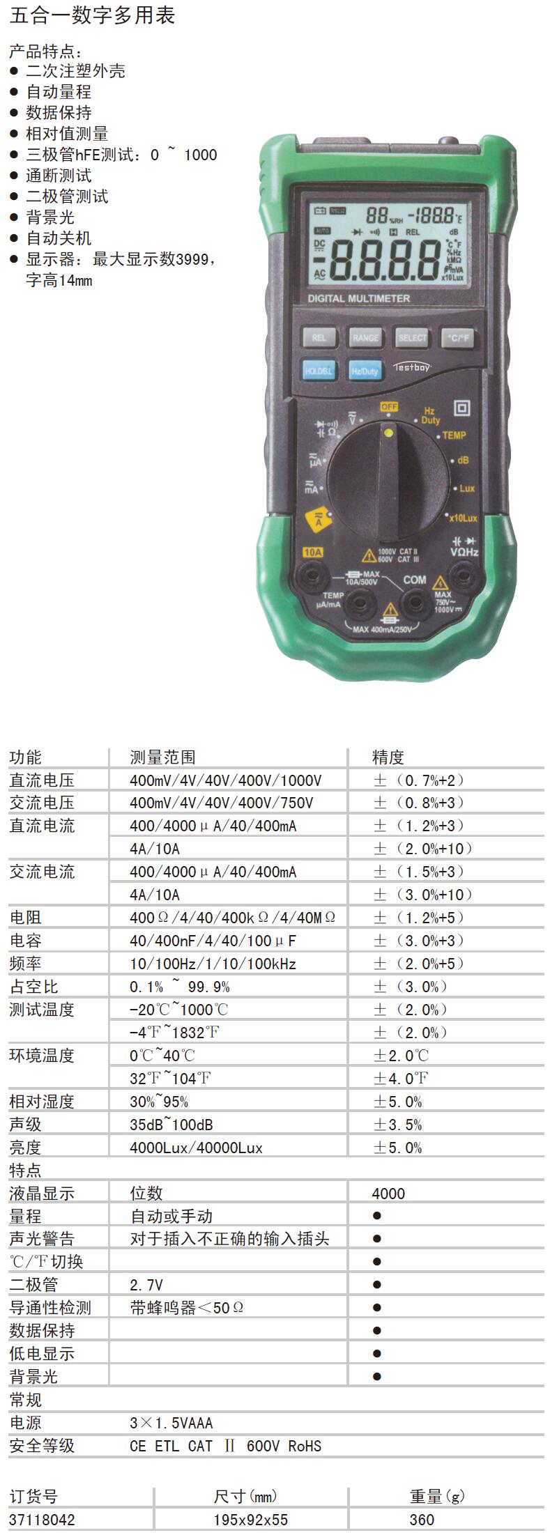 自动量程 数据保持 相对值测量 三极管hFE测试:0 ~ 1000 通断测试 二极管测试 背景光 自动关机 显示器:最大显示数3999,字高14mm