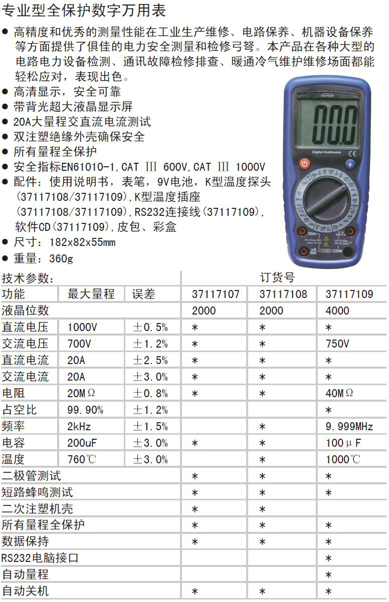 ·高精度和优秀的测量性能在工业生产维修、电路保养、机器设备保养 等方面提供了俱佳的电力安全测量和检修弓弩。本产品在各种大型的 电路电力设备检测、通讯故障检修排查、暖通冷气维护维修场面都能 轻松应对,表现出色。 ·高清显示,安全可靠 ·带背光超大液晶显示屏 · 20A大量程交直流电流测试 · 双注塑绝缘外壳确保安全 · 所有量程全保护 · 安全指标EN61010-1,CAT Ⅲ 600V,CAT Ⅲ 1000V ·配件:使用说明书,表笔,9V电池,K型温度探头 ·(37117108/37117109),K型温度插座 ·(37117108/37117109),RS232连接线(37117109), ·软件CD(37117109),皮包、彩盒