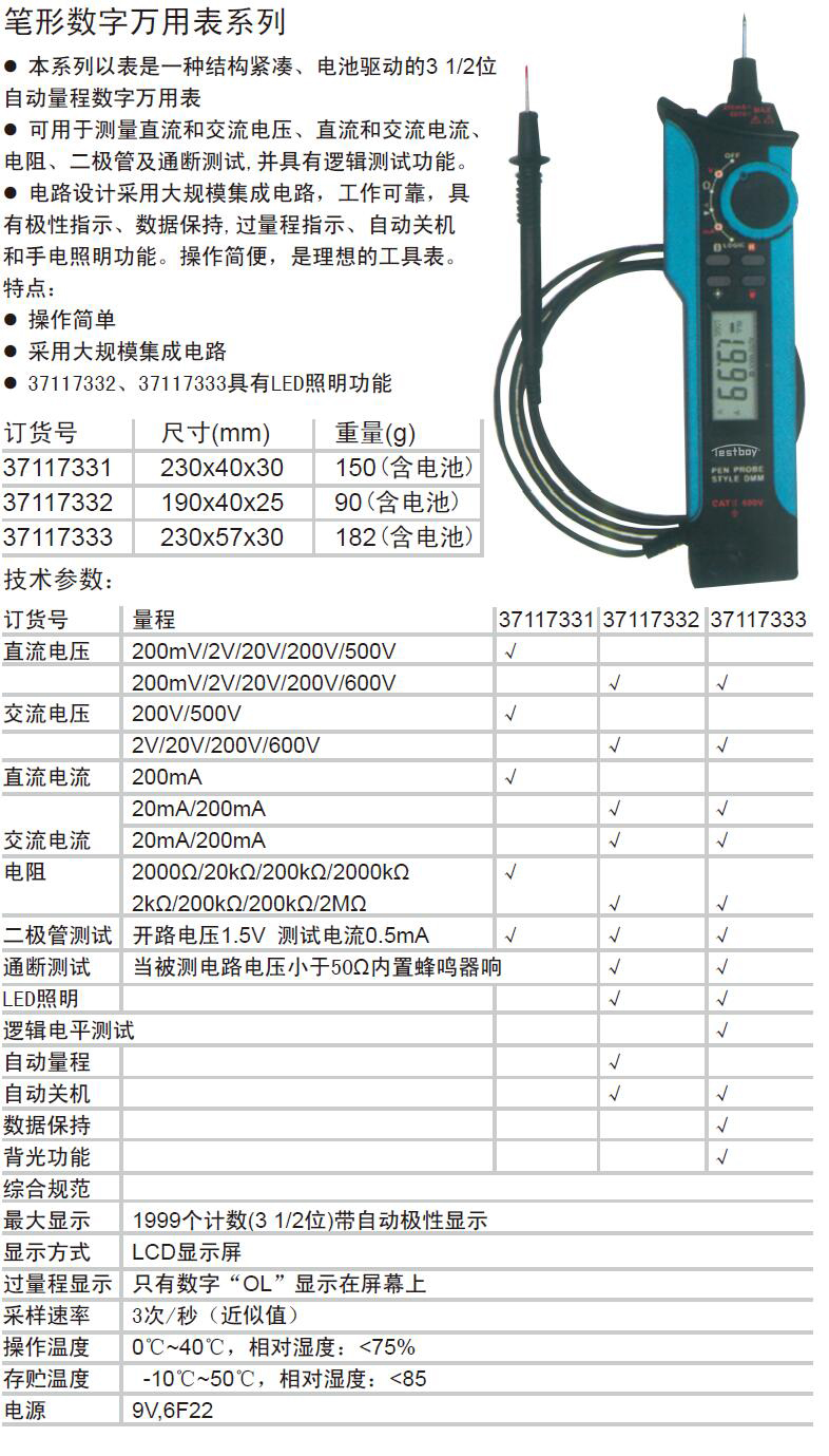 ·本系列以表是一种结构紧凑、电池驱动的3 1/2位自动量程数字万用表 ·可用于测量直流和交流电压、直流和交流电流、电阻、二极管及通断测试,并具有逻辑测试功能。 ·电路设计采用大规模集成电路,工作可靠,具有极性指示、数据保持,过量程指示、自动关机和手电照明功能。操作简便,是理想的工具表。 ·特点: ·操作简单 ·采用大规模集成电路 ·37117332、37117333具有LED照明功能