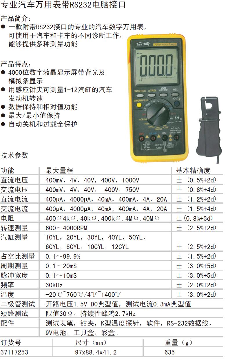 ·产品简介: · 一款附带RS232接口的专业的汽车数字万用表, ·可使用于汽车和卡车的不同诊断工作, ·能够提供多种测量功能 ·产品特点: · 4000位数字液晶显示屏带背光及 ·模拟条显示 · 用感应钳夹可测量1-12汽缸的汽车 ·发动机转速 ·数据保持和相对值功能 ·最大/最小值保持 · 自动关机和过载全保护 ·配件:测试表笔,钳夹,K型温度探针,软件,RS-232数据线,9V电池,工具盒,彩盒。