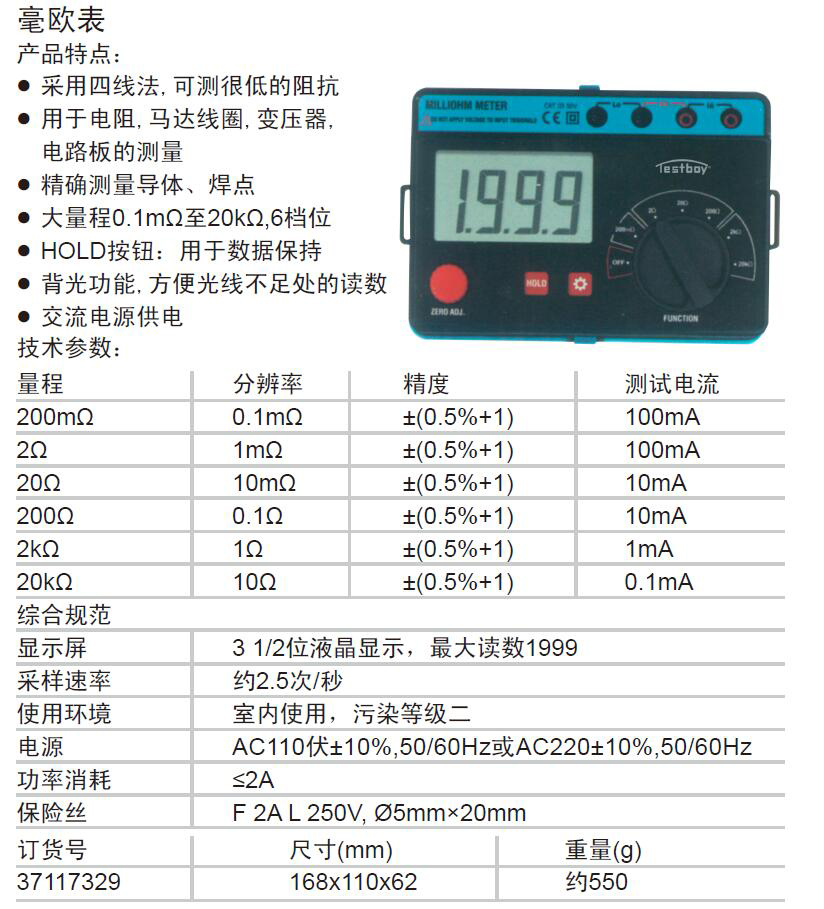 ·采用四线法,可测很低的阻抗 · 用于电阻,马达线圈,变压器, 电路板的测量 · 精确测量导体、焊点 · 大量程0.1mΩ至20kΩ,6档位 · HOLD按钮:用于数据保持 · 背光功能,方便光线不足处的读数 · 交流电源供电