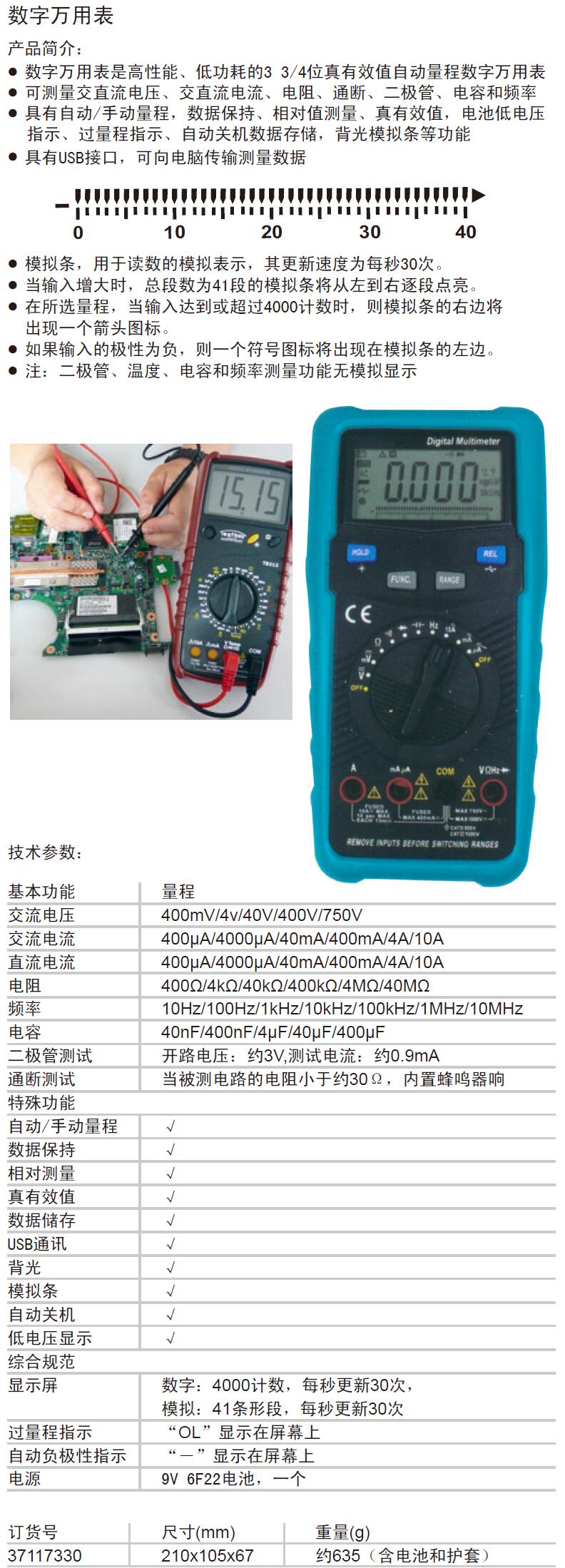 A51340 37117330 400μA/4000μA/40mA/400mA/4A/10A 400mV/4v/40V/400V/750V 400μA/4000μA/40mA/400mA/4A/10A 400μA/4000μA/40mA/400mA/4A/10A 400Ω/4kΩ/40kΩ/400kΩ/4MΩ/40MΩ 10Hz/100Hz/1kHz/10kHz/100kHz/1MHz/10MHz 40nF/400nF/4μF/40μF/400μF 开路电压:约3V,测试电流:约0.9mA 当被测电路的电阻小于约30Ω,内置蜂鸣器响 1215.00