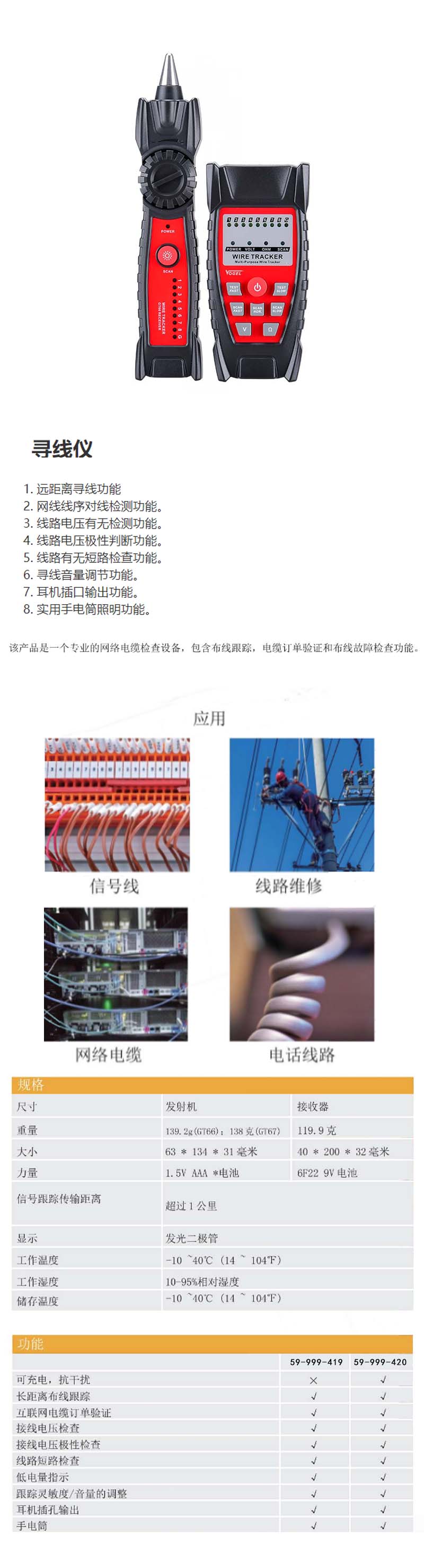 ·远距离寻线功能; ·网线线序对线检测功能; ·线路电压有无检测功能; ·远距离寻线功能; ·网线线序对线检测功能; ·线路电压有无检测功能; ·线路电压极性判断功能; ·线路有无短路检查功能; ·电池低电提示功能; ·寻线灵敏度/音量调节功能; ·耳机插口输出功能; ·实用手电筒照明功能。