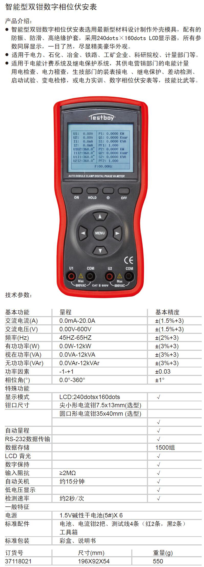 产品介绍: · 智能型双钳数字相位伏安表选用最新型材料设计制作外壳模具,配有的 防振、防滑、高绝缘护套,采用240dots×160dots LCD显示器,所有参 数同屏显示,一目了然,尽显精美豪华外观。 ·适用于电力、石化、冶金、铁路、工矿企业、科研院校、计量部门等。 · 适用于电能计费系统及继电保护系统,其供电营销部门的电能计量 用电检查、电力稽查,生技部门的装表接电 、继电保护、差动检测、 启动试验、变电检修,或电力实训、数字相位伏安表等,技能比武等。 ·一般特征:电源:1.5V碱性干电池(5#)X ·标准配件:电池、电流钳2把、测试线4条(红2条,黑2条)工具箱 ·标准包装:彩盒、说明书
