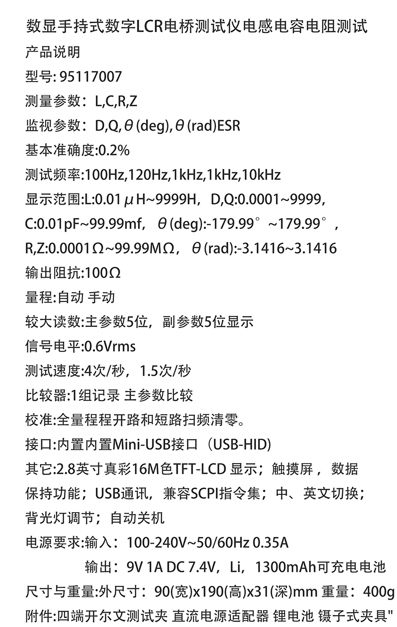 数显手持式数字LCR电桥测试仪 95117007 100Hz/120Hz/1kHz/10kHz/100kHz 1台