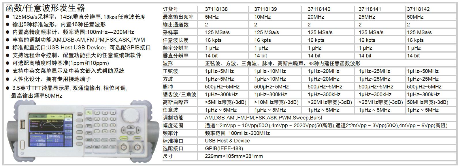 A51344 37118141 2 25MHz 16 kpts 125 MSa/s 14 bit 1 μHz 正弦波、方波、三角波、脉冲、高斯白噪声,48种内建任意函数波形 1μHz~25MHz 1μHz~25MHz 500μHz~5MHz 1μHz~300kHz >25MHz带宽(-3dB) 1μHz ~ 5MHz AM,DSB-AM ,FM,PM,FSK,ASK,PWM,Sweep,Burst 通道1:2mVpp ~ 10Vpp(50Ω),4mVpp ~ 2020Vpp(50高阻),通道2:2mVpp ~ 3Vpp(50Ω),4mVpp ~ 6Vpp(高阻) 频率范围 100mHz~200MHz USB Host & Device GPIB(IEEE-488) 229mm×105mm×281mm 22399.50