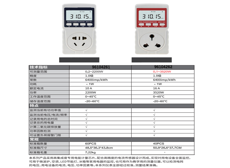 H14773 96104261 0.2~2200W 1.0级 6400imp/kWh “<1W ·本系列产品采用高集成度专用电能计量芯片,配合高精度的电流传感器设计而成。实现对用电设备全面监控,可用于微波炉、空调、LED节能灯、冰箱等家用电器的监控,也可用作为教学用的测量仪器,可以检测电网的电压,用电设备的电流、电压、功率因素等。本系列仪表全部经过校准,测量结果准确。 2200w -20~60°c 400.00