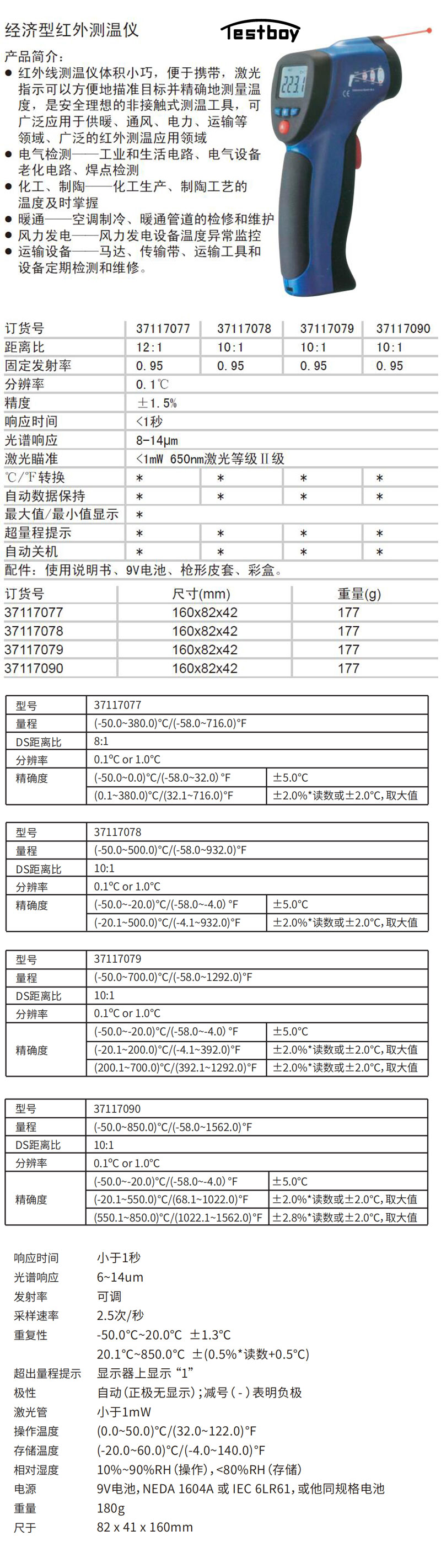·红外线测温仪体积小巧,便于携带,激光指示可以方便地描准目标并精确地测量温度,是安全理想的非接触式测温工具,可广泛应用于供暖、通风、电力、运输等领域、广泛的红外测温应用领域 ·电气检测——工业和生活电路、电气设备、老化电路、焊点检测 ·化工、制陶——化工生产、制陶工艺的温度及时掌握 ·暖通——空调制冷、暖通管道的检修和维护 ·风力发电——风力发电设备温度异常监控 ·运输设备——马达、传输带、运输工具和设备定期检测和维修。