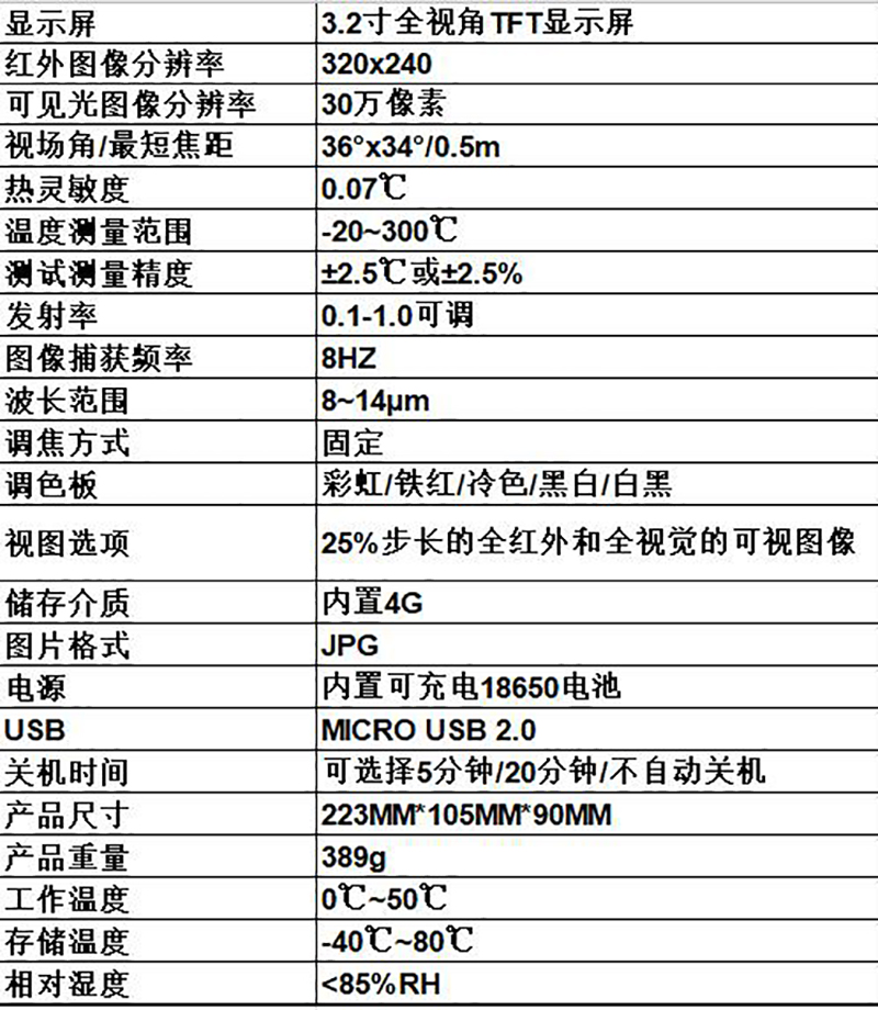 B58959 KV0019 -20℃~300℃ ±2.5℃或±2.5% 固定 320×240 30万像素 36°×34°/0.5m 0.07℃ 0.1~1可调 8Hz 8~14µm 彩虹/铁红/冷色/黑白/白黑 25%步长的全红外和全视觉的可视图像 内置4G JPG 49985.80