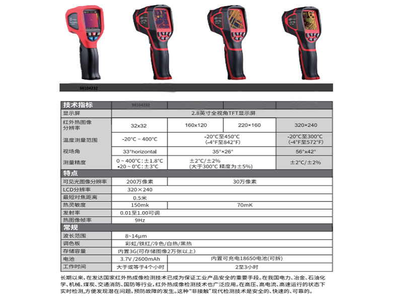 H14745 96104232 ‘-20-400℃ 0~ 400°C:+1.8°℃-20 ~0C:±3℃ 0.01至1.00可调 “32x32 ·长期以来,在发达国家红外热成像检测技术已成为保证工业产品安全的重要手段。在我国电力、冶金、石油化学、机械、煤炭、交通消防、国防等行业,红外热成像检测技术也广泛应用。在高压、高电流、高速运行的状态下实时检测,方便发现潜在问题,预防故障的发生。这种“非接触"现代检测技术是安全的、快速的、可靠的。 200万像素 8~14um 7300.00