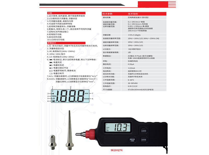 ·设计简单、结构紧凑,便于随身携带使用 ·LCD直观显示测量值、测量状态 ·可测量加速度、速度及位移 ·可选择不同振动频率特性 ·采用高灵敏度探头,测量准确 ·配备长、短探头各一个,适合各种不同场所测量 ·设有AC信号输出接口 ·低电指示功能 ·自动关机功能10.LCD背光灯功能
