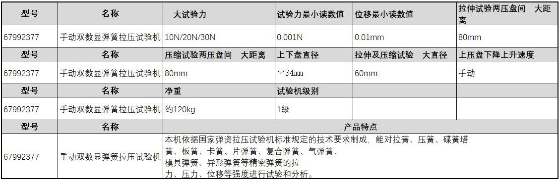 ·本机依据国家弹资拉压试验机标准规定的技术要求制成,能对拉簧、压簧、碟簧塔 簧、板簧、卡簧、片弹簧、复合弹簧、气弹簧、 模具弹簧、异形弹簀等精密弹簧的拉 力、压力、位移等强度进行试验和分析。