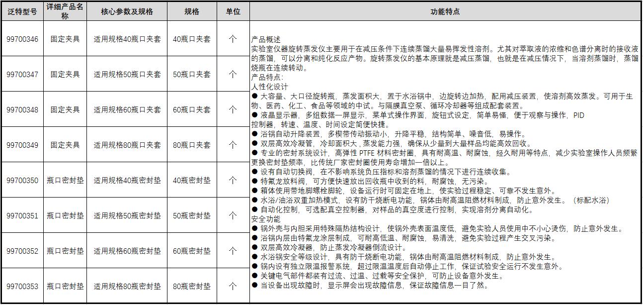 ·大容量、大口径旋转瓶,蒸发面积大,置于水浴锅中,边旋转边加热,配用减压装置,使溶剂高效蒸发。可用于生物、医药、化工、食品等领域的中试。与隔膜真空泵、循环冷却器等组成配套装置。