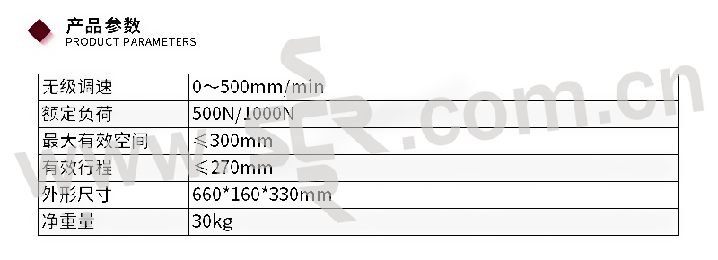 ·无级调速:0~500mm/min