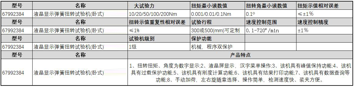 ·扭转扭矩、角度为数字显示; ·液晶屏显示,汉字菜单操作; ·该机具有峰值保持功能; ·该机具有过载保护功能; ·该机具有刚度计算功能; ·该机具有结果打印功能; ·该机具有数据查询等功能; ·手动加荷,左右旋随意选择、操作简单,检测速度快、装夹方便。
