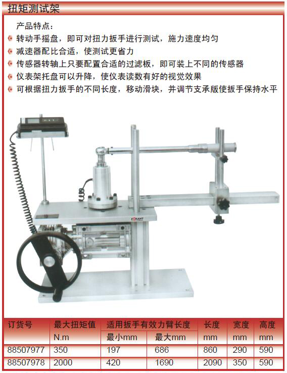 ·产品特点: ·转动手摇盘,即可对扭力扳手进行测试,施力速度均匀 ·减速器配比合适,使测试更省力 ·传感器转轴上只要配置合适的过滤板,即可装上不同的传感器 ·仪表架托盘可以升降,使仪表读数有好的视觉效果 ·可根据扭力扳手的不同长度,移动滑块,并调节支承版使扳手保持水平