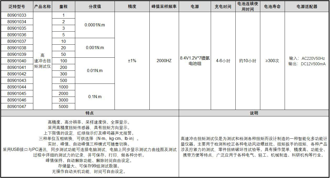 ·高精度、高分辨率、采样速度快、全屏显示。 ·采用高精度扭矩传感器,具有扭矩方向显示。 ·上下限值的设定,红绿指示灯及峰鸣器声光报警。 ·高速冲击扭矩测试仪是为测试和检测各种扭矩而设计制造的一种智能化多功能计量仪器。 ·主要用于检测和校正各种电动风动螺丝批、扭矩扳手的扭矩,各种产品涉及拧紧力的测试,零件扭转破坏性试验等。 ·具有操作简单,精度高、功能全、携带方便等特点。