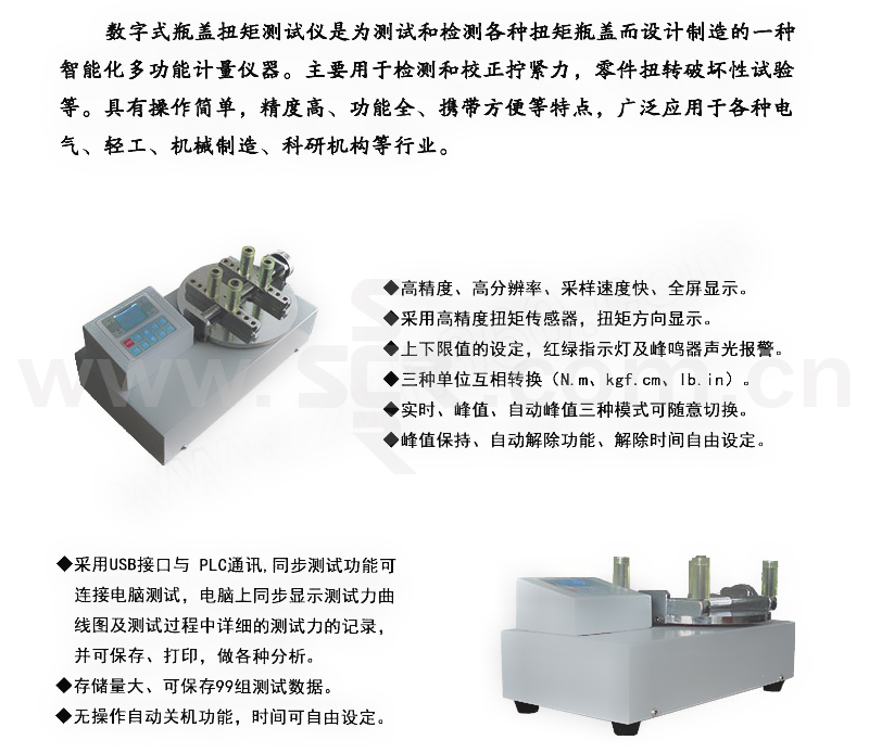 ·高精度、高分辨率、采样速度快、全屏显示。·采用高精度扭矩传感器,具有扭矩方向显示。·上下限值的设定,红绿指示灯及峰鸣器声光报警。·三种单位互相转换,可供选择(N·m、kgf·cm、Ib·in)。·实时、峰值、自动峰值三种模式可随意切换。·采用USB接口与PC通讯,同步测试功能可连接电脑测试,电脑上同步显示测试力曲线图及测试过程中详细的测试力的记录,并可保存、打印,做各种分析。·峰值保持、自动解除功能、解除时间自由设定。·存储量大、可保