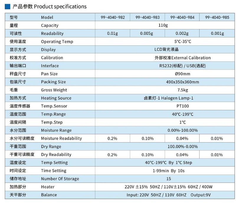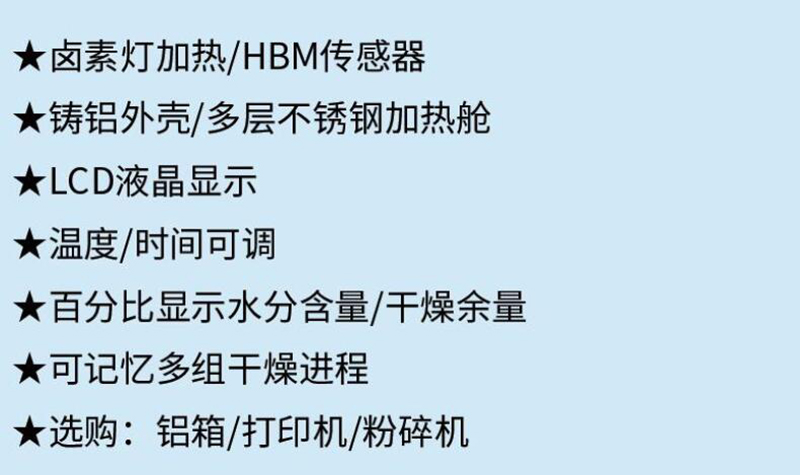 ·卤素灯加热/HBM传感器 ·铸铝外壳/多层不锈钢加热舱 ·LCD液晶显示 ·温度/时间可调 ·百分比显示水分含量/干燥余量 ·可记忆多组干燥进程 ·选购:铝箱/打印机/粉碎机