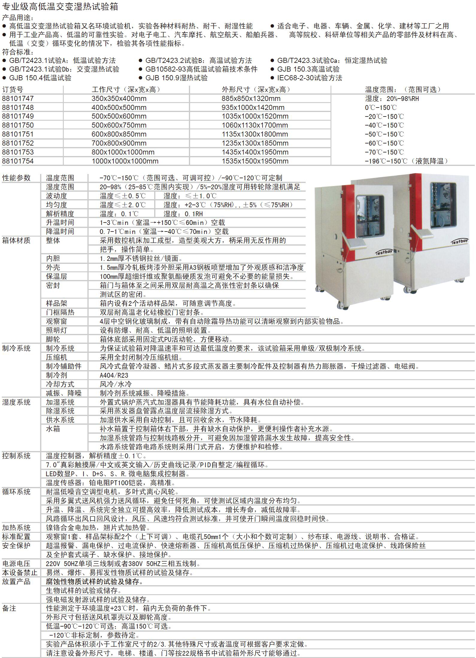 ·性能参数 温度范围 -70℃-150℃(范围可选、可调可控)/-90℃-120℃可定制 ·湿度范围 20-98%(25-85℃范围内实现)/5%-20%湿度可用转轮除湿机满足 ·波动度 温度≤±0.5℃ 湿度:≤±1.0℃ ·均匀度 温度≤±2.0℃ 湿度:+2-3℃(75%RH),,±5%(≤75%RH) ·解析精度 温度:0.1℃ 湿度:0.1RH ·升温时间 1-3℃min(室温→+150℃≤60min)空载 ·降温时间 0.7-1℃min(室温→-40℃≤70min)空载 ·箱体材质 整体 采用数控机床加工成型,造型美观大方,柄采用无反作用的 把手,操作简单。 ·内胆 1.2mm厚不锈钢拉丝/镜面。 ·外壳 1.5mm厚冷轧板烤漆外胆采用A3钢板喷塑增加了外观质感和洁净度 ·保温层 100mm厚超细纤维或聚氨酯硬质发泡可避免不必要的能量损失。 ·密封 箱门与箱体至之间采用双层耐高温之高张性密封条以确保 ·测试区的密闭。 ·样品架 箱内设有2个活动样品架,可随意调节高度。 ·门框隔热 双层耐高温老化硅橡胶门密封条。 ·观察窗 4层中空钢化玻璃制成,带有自动除霜导热功能可以清晰观察到内部实验物品。 ·照明灯 设有防爆、耐高、低温的照明装置。 ·脚轮 箱体底部采用固定式PU活动轮,方便移动。 ·制冷系统 制冷系统 为保证试验箱对降温速率和可达最低温度的要求,该试验箱采用单级/双极制冷系统。 ·压缩机 采用全封闭制冷压缩机组。 ·制冷辅助件 风冷式盘管冷凝器、鳍片式多段式蒸发器主要制冷配件及控制器有热力膨胀器,干燥过滤器、电磁阀。 ·制冷剂 A404/R23 ·冷却方式 风冷/水冷 ·减振、降噪 制冷剂系统减振、降噪措施。 ·湿度系统 加湿系统 外置式锅炉蒸汽式加湿器具有节能降耗功能,具有水位自动补偿。 ·除湿系统 采用蒸发器盘管露点温度层流接除湿方式。 ·供水系统 加湿供水采用自动控制,且可回收余水,节水降耗。 ·水箱 补水箱置于控制箱体右下部,并有缺水自动保护,更便利操作者补充水源。 ·加湿系统管路与控制线路板分开,可避免因加湿管路漏水发生故障,提高安全性。 ·水路系统管路电路系统则采用门式开启,方便维护和检修。 ·控制系统 温度控制器,解析精度±0.1℃。 ·7.0"真彩触摸屏/中文或英文输入/历史曲线记录/PID自整定/编程循环。 ·LED数显P、I、D+S、S、R.微电脑集成控制器。 ·温度传感器:铂电阻PT100铠装,高精准。 ·循环系统 耐温低噪音空调型电机,多叶式离心风轮。 ·采用多翼式送风机强力送风循环,避免任何死角,可使测试区域内温度分布均匀。 ·升温、降温、系统完全独立可提高效率,降低测试成本,增长寿命,减低故障率。 ·风路循环出风口回风设计,风压、风速均符合测试标准,并可使开门瞬间温度回稳时间快。 ·加热系统 镍铬合金电加热,翘片式加热管。 ·标准配置 观察窗1套、样品架标配2个(上下可调)、电缆孔50mm1个(大小和个数可定制)、纱布球、电源线、说明书、合格证。 ·安全保护 超温报警、漏电保护、过电流保护、快速熔断器、压缩机高低压保护、压缩机过热保护、压缩机过电流保护、线路保险丝 ·及全护套式端子、缺水保护、接地保护。 ·电源电压 220V 50HZ单项三线制或者380V 50HZ三相五线制。 ·本设备禁止 易燃、爆炸、易挥发性物质试样的试验及储存。 ·放置产品 腐蚀性物质试样的试验及储存。 ·生物试样的试验或储存。 ·强电磁发射源试样的试验及储存。 ·备注 性能测定于环境温度+23℃时,箱内无负荷的条件下。 ·外形尺寸包括送风机罩壳以及脚轮高度。 ·低温-90℃-120℃可选;高温150℃可选。 ·-120℃非标定制,参数待定。 ·实验产品体积须小于工作室尺寸的2/3.其他特殊尺寸或者温度可根据客户要求定做。 ·请注意设备外形尺寸,电梯、楼道、门等按22规格书中试验箱外形尺寸能够通过
