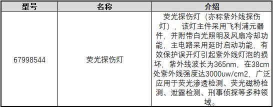 ·荧光探伤灯(亦称紫外线探伤灯),该灯主件采用飞利浦元器件,并附带白光照明及风扇冷却功能,主电路采用延时启动功能,有效保护误开灯引起紫外线灯泡的损坏,紫外线波长为365nm,在38cm处紫外线强度达3000uw/cm2,广泛应用于荧光渗透检测、荧光磁粉检测、泄露检测、刑事侦探等多种领域。