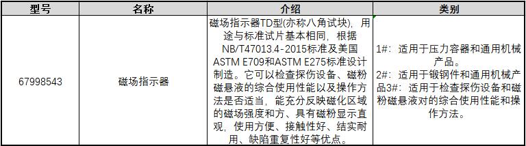 ·磁场指示器TD型(亦称八角试块),用途与标准试片基本相同,根据NB/T47013.4-2015标准及美国ASTM E709和ASTM E275标准设计制造。 ·它可以检查探伤设备、磁粉磁悬液的综合使用性能以及操作方法是否适当,能充分反映磁化区域的磁场强度和方、具有磁粉显示直观,使用方便、接触性好、结实耐用、缺陷重复性好等优点。