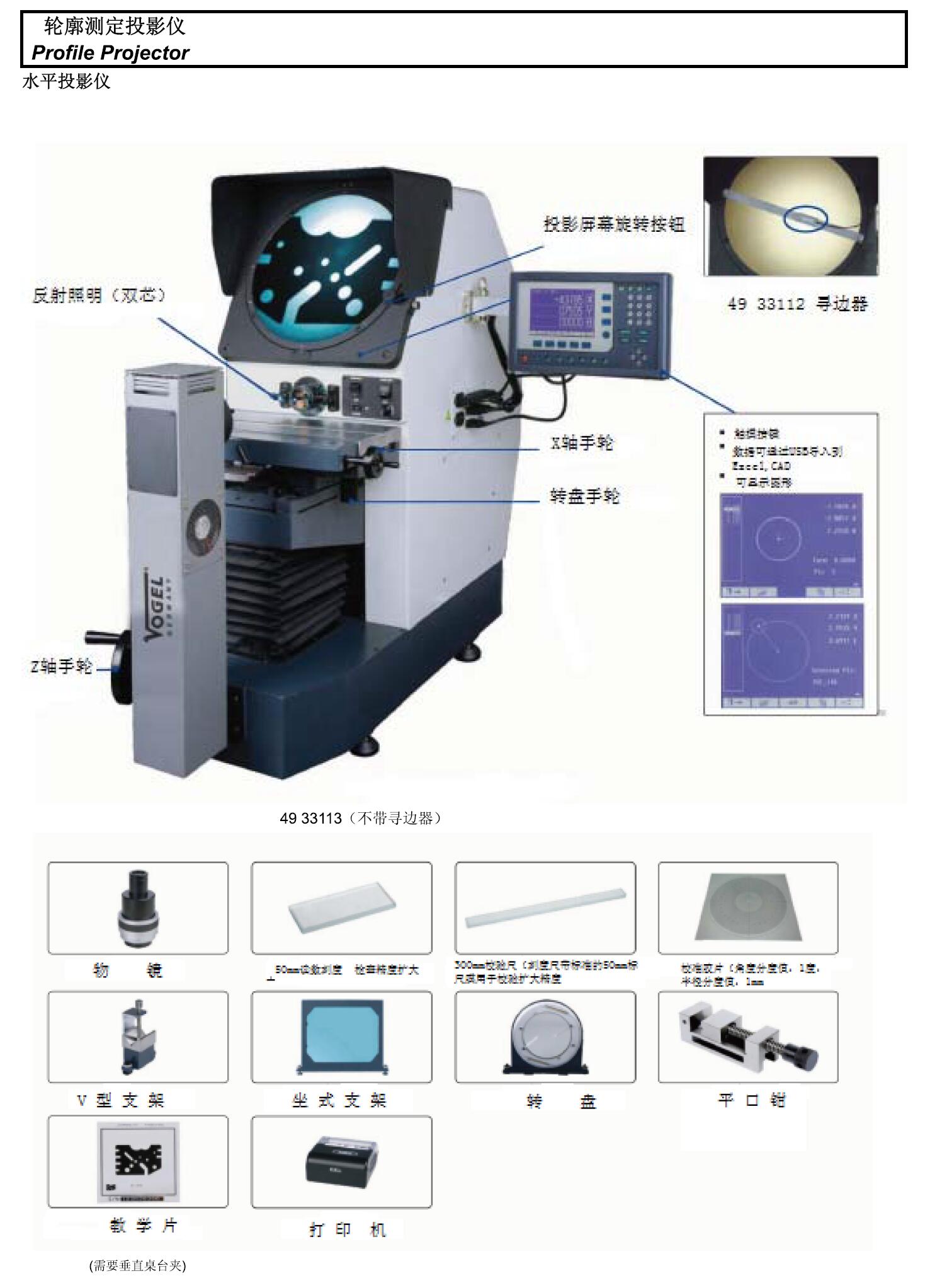 B14096 49 33113 不配置 直径: Ø300mm; 旋转范围: 0° - 360° 分辨 率: 1" 或 0.05° 基准线: 十字线 50X(可选) 100×(可选) 10X(标配) 20X(可选) Ø30mm/Ø15mm/Ø6mm/Ø3mm 77.7mm/44.3mm/38.4mm/25.3mm ±0.08% 400X150mm ±15° 行程:200×100mm.分辨率:0.5μm.精度:(4+L/25)L是测量长度(单位: mm) 75mm 250KG 透射光源:24V/150W卤素灯泡.布光.亮度都可调节 反射光:12V/150W卤素灯泡〔双光纤照明).可调节照明水平和位置 ×-Z轴移动坐标.旋转角度投影屏幕 RS232C.USB(连接电脑.测量数据可导入Excel.CAD) 编程.用于批量测量工件 1090×830×1010mm 160KG 246632.00