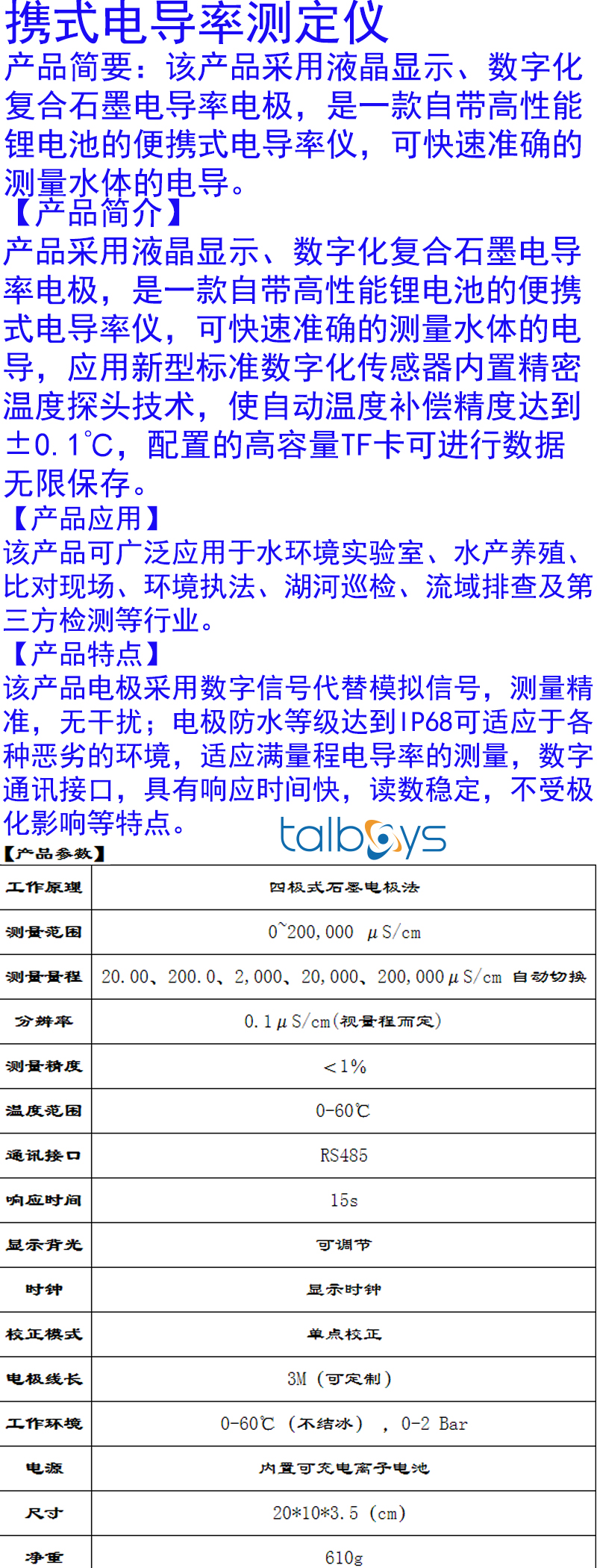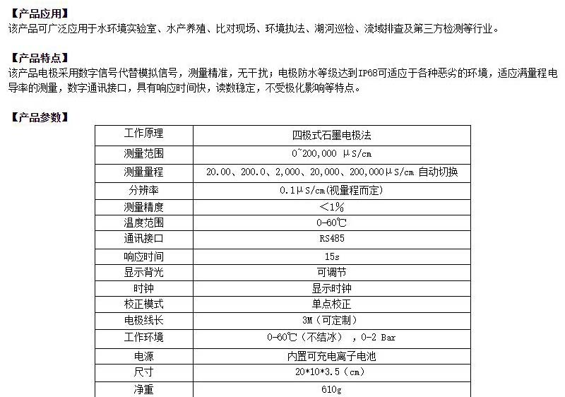 ·该产品电极采用数字信号代替模拟信号,测量精准,无干扰;电极防水等级达到IP68可适应于各种恶劣的环境,适应满量程电导率的测量,数字通讯接口,具有响应时间快,读数稳定,不受极化影响等特点。标准配置:主机,双光路数字电极,便携箱,充电器